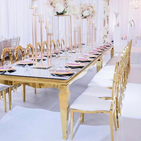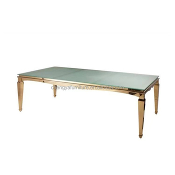 Düğün mobilyası metal dikdörtgen altın paslanmaz çelik cam yemek masası